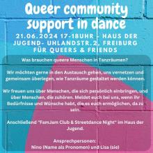 Queer Community Support in Dance Freitag, 21.06.24 um 17:00 Uhr - Fr., 21.06.2024 - 18:00 Was brauchen queere Menschen in Tanzräumen? Haus der Jugend, Jugendbildungswerk