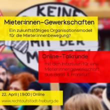 Mieter:innen-Gewerkschaften. Ein zukunftsfähiges Organisationsmodell für die Mieter:innenbewegung? Donnerstag, 22.04.21 um 19:00 Uhr - Do., 22.04.2021 - 21:00 Online-Talkrunde mit den Initiativen für eine Mieter:innen-Gewerkschaft in Berlin & Frankfurt Online