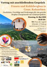 Frauen und Kohlebergbau in Cesar, Kolumbien: Geschichten, Vorschläge und Forderungen für eine gerechte Bergbau-Energiewende mit Genderperspektive. Dienstag, 16.05.23 um 18:30 Uhr Mujeres y minería de Carbón en el César, Colombia: Historias, propuestas y demandas para una transición minero-energética justa con enfoque de género desde los territorios. Haus der Jugend, Jugendbildungswerk