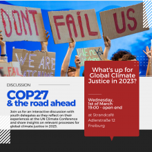 Reflections on COP27 & the road ahead Mittwoch, 01.03.23 um 19:00 Uhr What's up for Global Climate Justice in 2023? Strandcafé