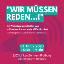 "WIR MÜSSEN REDEN...!" Samstag, 18.02.23 um 15:30 Uhr - Sa., 18.02.2023 - 19:00 Ein Workshop zum Halten von politischen Reden in der Öffentlichkeit Linkes Zentrum Freiburg (LiZ)